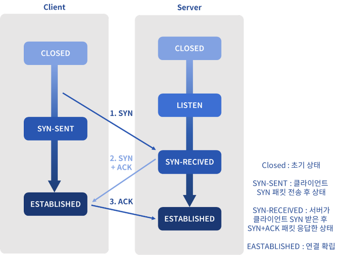 - 통신 시작 전 송신자와 수신자의 연결을 설정 → “3-way handshake”