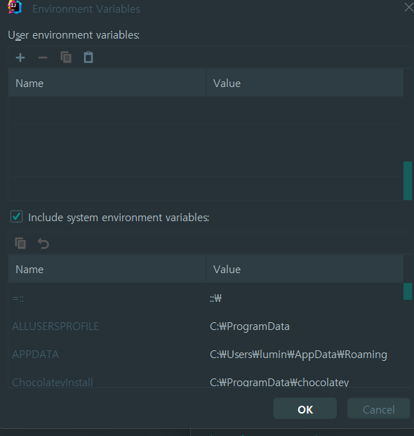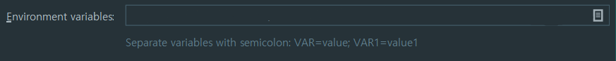 4. Environment variables 창이 나타나면 창 바로 아래 아래 예시처럼 KEY=values; KEY2=values2; 이런 식으로 쭉 작성하거나
