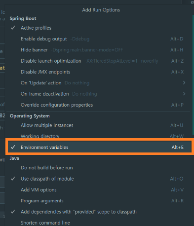 3. Modify options를 눌러 Option들 중 Environment variables를 클릭해서 편집창에 나타나도록 한다.