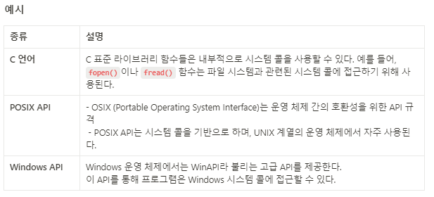 ✨ 보통 C나 C++같은 고급언어로 작성된 프로그램 들은 직접 시스템 호출을 사용할 수 없기 때문에 고급 API를 통해 시스템 호출에 접근하게 하는 방법을 말한다.