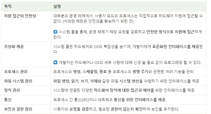 시스템 콜은 운영체제의 핵심 요소 중 하나로 응용 프로그램으로부터 직접적인 하드웨어 접근을 제한해서 시스템의 안전을 보장하고 효율적인 통신을 가능하게 한다. 개발자로부터 복잡한 하드웨어와 직접 통신하지 않고 자원을 활용할 수 있게 해주며 모든 프로그램이 일관된 API를 통해 시스템 자원을 사용할 수 있게 해준다는 장점이 있다.