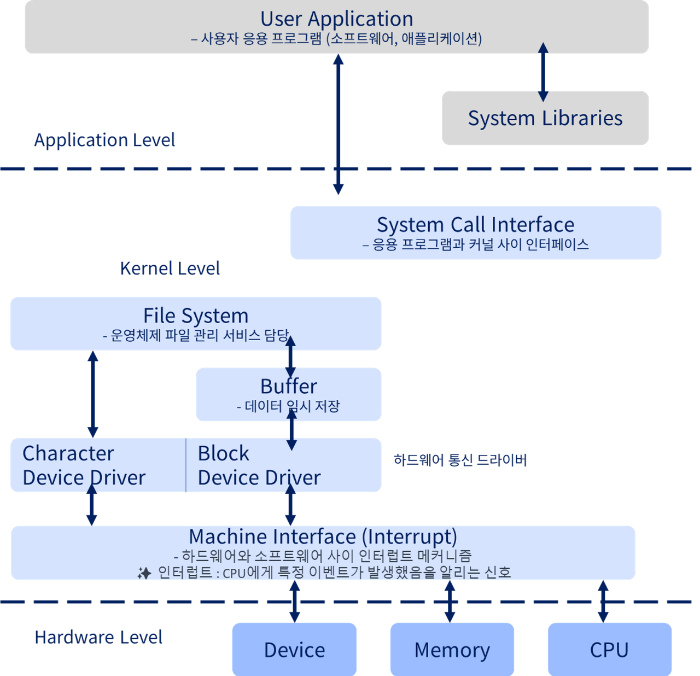 응용 프로그램이 하드웨어 자원이나 특정 시스템 기능에 접근하려 할 때, 시스템 콜을 통해 커널모드로 전환된다.