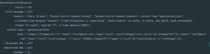 test 코드에서 Member를 생성해주는데 디버깅하면 잘 들어가고 있지만 print해서 출력결과를 아무리 살펴봐도 자꾸 Response가 아래와 같이 나왔다. data값도 안 들어가고 pageInfo에 정보도 이상하게 들어가고 있었다.
