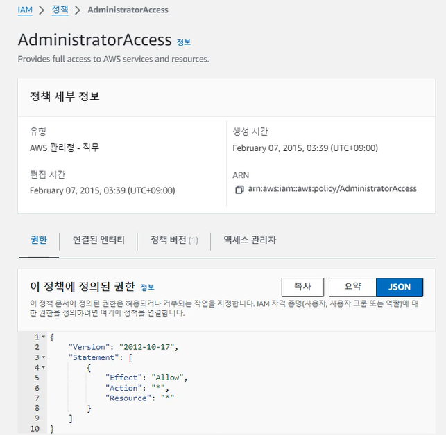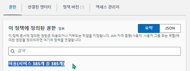 옆의 요약 버튼을 누르면 이 정책이 어떤 권한들을 포함하고 있는지 리스트로 보여준다. 이렇게 정책을 새롭게 만들어서 추가할 수도 있다.