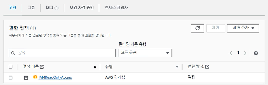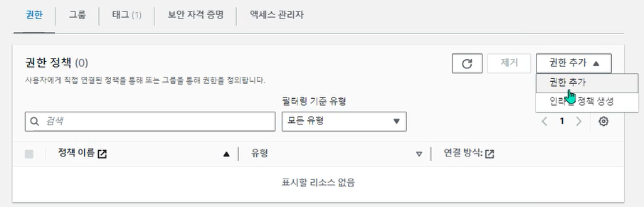 2-2. 넘어가서 원하는 권한 정책 선택해서 추가 후 그룹 생성 클릭