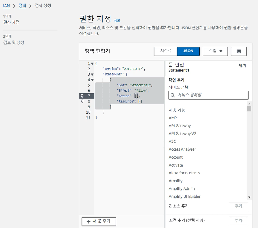 권한 지정은 시각적, JSON 둘 중 선택이 가능하다. 시각적으로 선택하게 되면 GUI로 원하는 서비스를 선택하고 원하는 액세스 수준을 선택해서 추가할 수 있가 때문에 쉽게 권한을 지정할 수 있다는 장점이 있다.