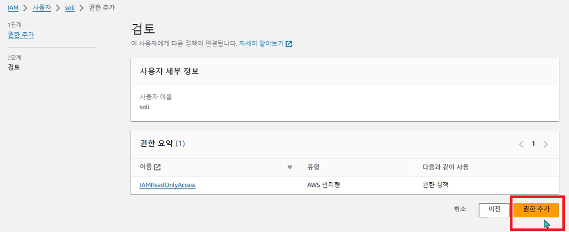 3-1. 사용자 > User 에서 권한에 보면 권한 추가가 있다. 권한 추가를 클릭한다.