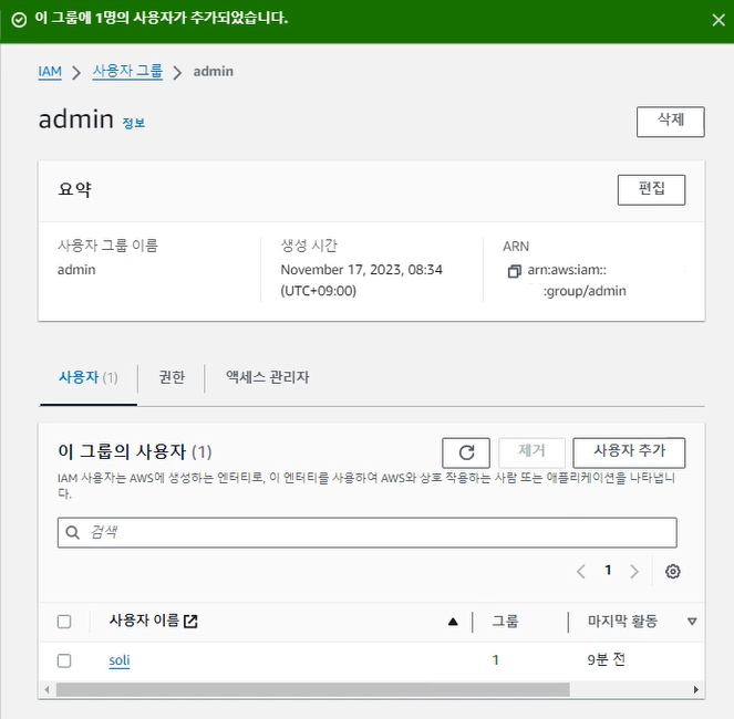 1. IAM > 사용자 그룹 admin 에서 사용자 제거