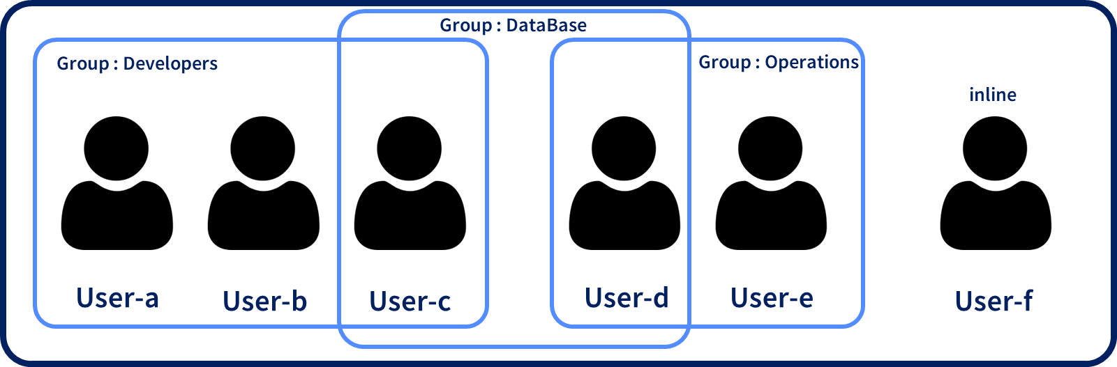 만약 아래 사진 처럼 a,b,c,d,e,f 라는 유저가 있고 각 역할을 준다고 할 때 [a, b, c] 는 Developer Group , [d, e]는 Operations 그룹, [c, d]는 또 다른 database라는 Group의 정책에도 연결 시킬 수도 있다. 그리고 유저 f는 그룹에 속하지 않을 수도 있다.