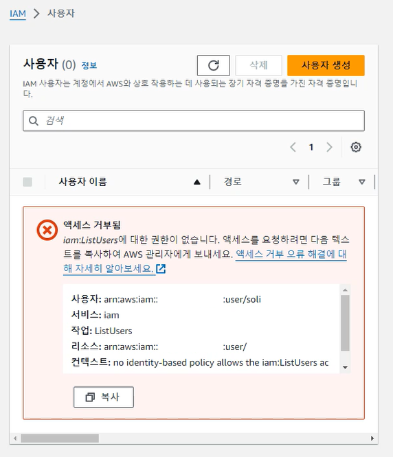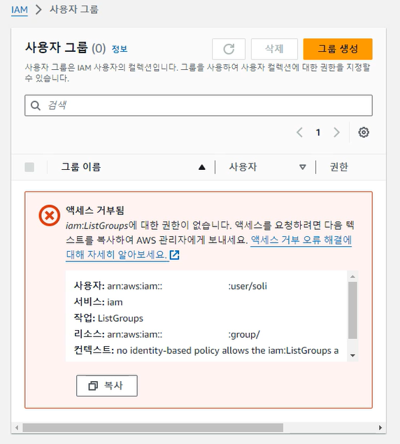 제거 후 사용자로 로그인한 창으로 가서 새로고침 해보면 액세스가 거부되어 있는 것을 확인할 수 있다. admin 권한으로 모든 AWS 관련 권한이 주어졌는데 그룹에서의 권한이 삭제 되었기 때문이다.