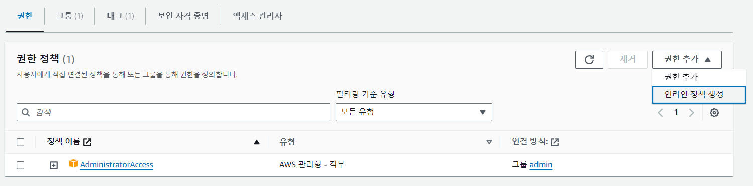 IAM > user 에서 권한에 `인라인 정책 생성` 클릭