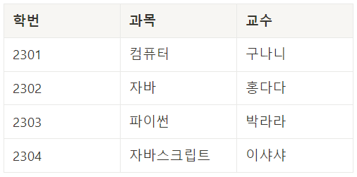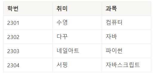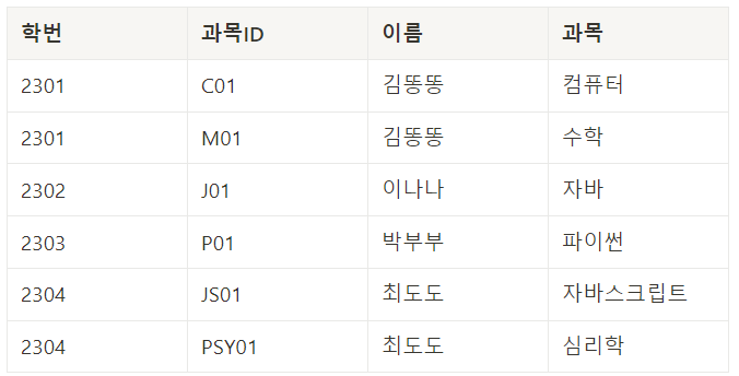 학번과 이름을 하나의 릴레이션으로 분리하고 수강과목을 다른 릴레이션으로 만들어 속성이 원자값만으로 구성되게 한다.