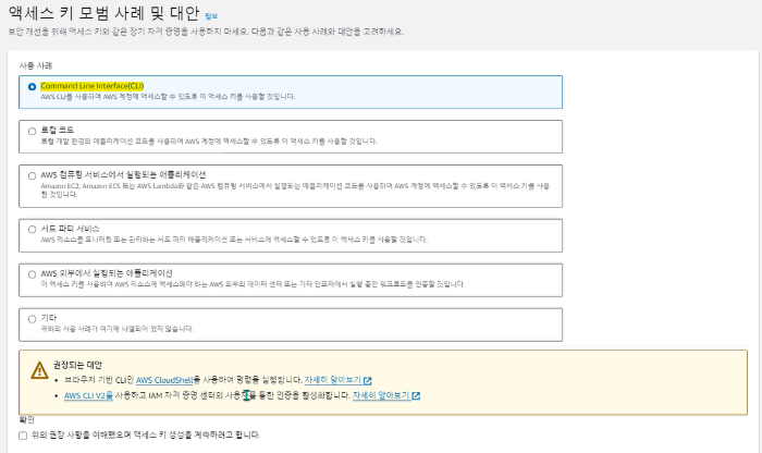 AWS CLI를 이용해서 계정에 접근할 예정이기 때문에 CLI 를 선택해서 발급받는다.