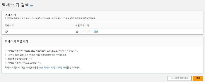✨ 적혀 있듯이 액세스키는 잊어버리면 다시 검색이 불가하다. 따라서, Secret Access Key는 따로 메모해두던가 .csv 파일을 다운로드 받아 두는 것이 좋다.