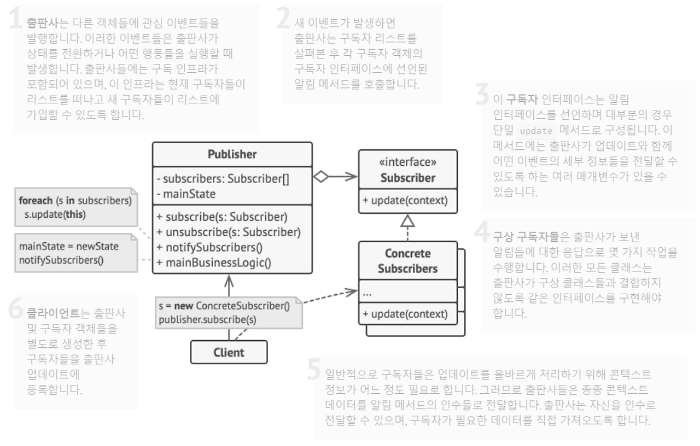 - 관찰 중인 객체의 변화가 있을 때 마다 메서드를 통해 목록에 있는 옵저버(관찰자)들에게 이벤트를 알려주고 조치(메커니즘)를 취하는 디자인 패턴이다.