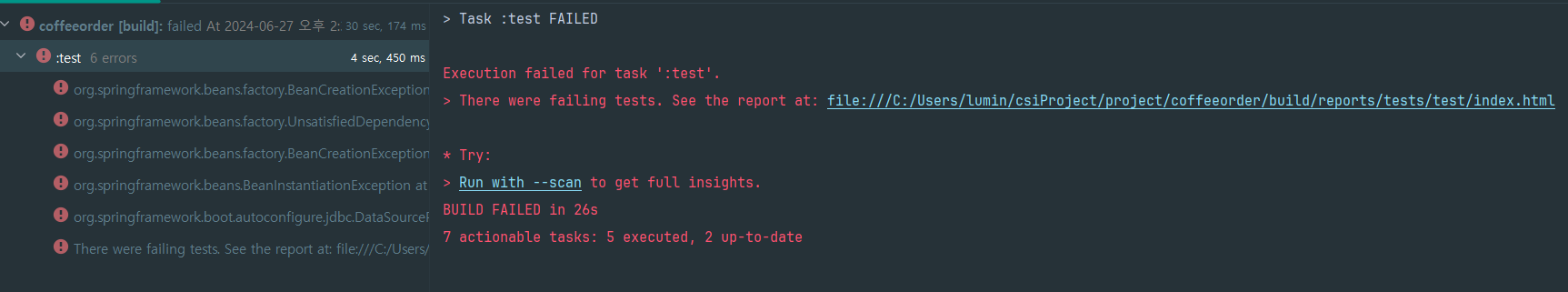 테스트 에러 문의 (Execution failed for task ':test'.) - 인프런