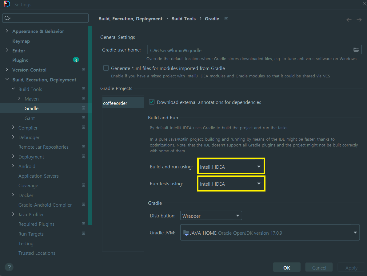 2. `Gradle` 을 검색하여 Build and run using & Run Tests using 을 Intellij IDEA로 바꾼다.