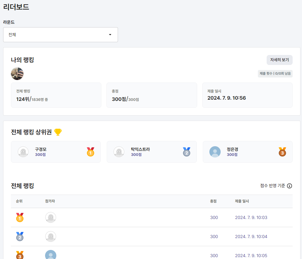 문제를 풀고나면 '리더보드'에서 나의 랭킹도 확인할 수 있다. 어제는 1324등이었낰ㅋㅋㅋㅋ 엄청난 등수였다! 🫨
