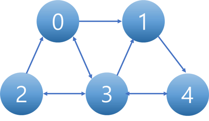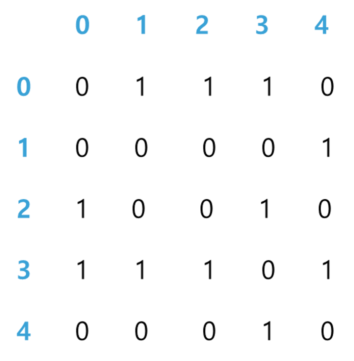아래의 그래프와 그래프를 인접 행렬로 표현한 것을 살펴보면 쉽게 이해할 수 있다. - 화살표에 따라 숫자가 정해지는데 화살표가 가리키면 1 아니면 0을 넣어준다.