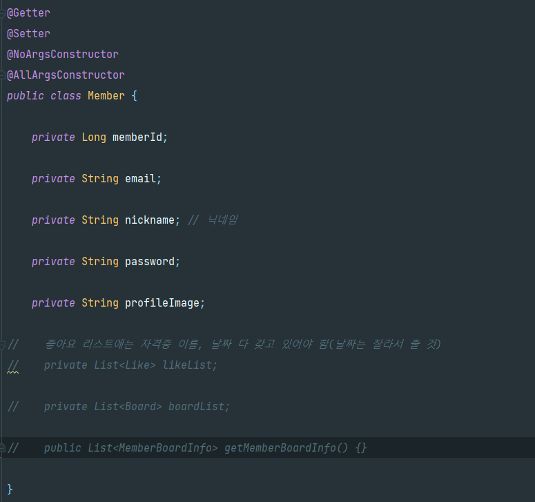 - 기본 생성자는 필수 ➡️ JPA가 엔티티 객체 생성 시 기본 생성자를 사용하기 때문